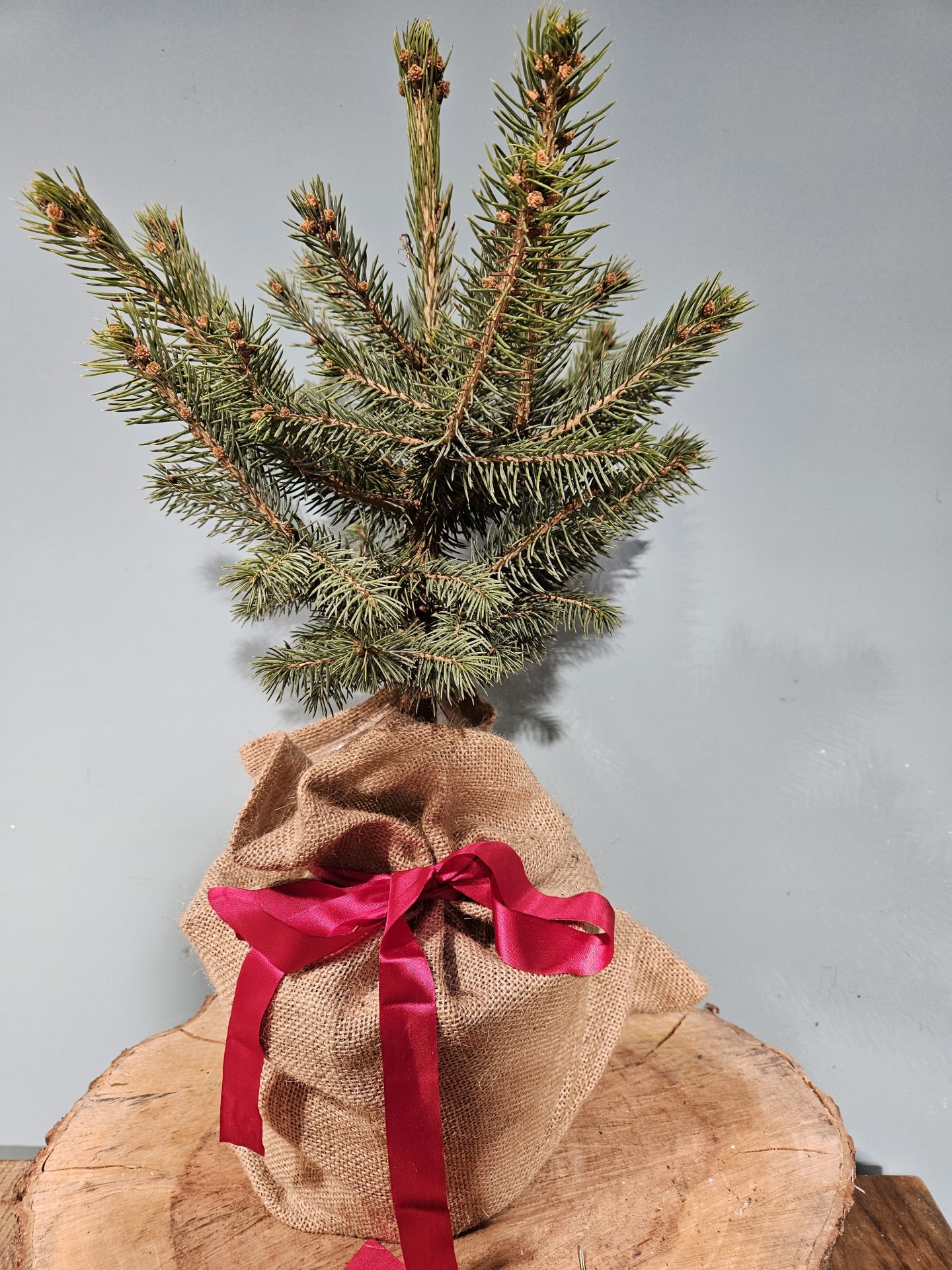 Our beautiful Blue Spruce Premium Table Top potted Christmas Tree (approx 40 – 60 cm in height) in a cute hessian sack with red ribbon – a lovely gift with a difference or perfect for a homely festive decoration for your own home