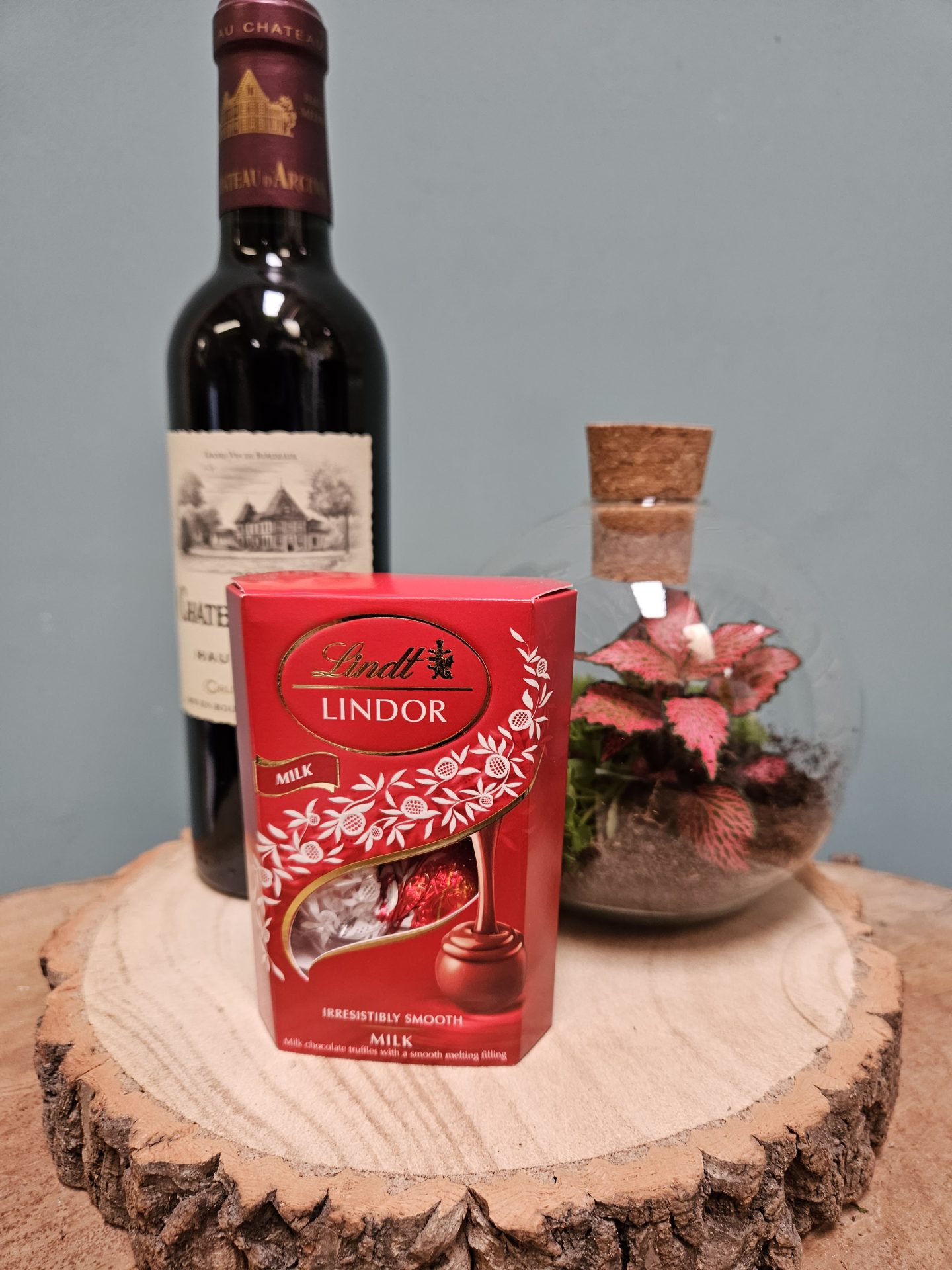 A lovely classy gift of a gorgeous little glass terrarium with a half bottle of red wine and a cheeky little Lindt treat, all gift wrapped on a wooden log slice