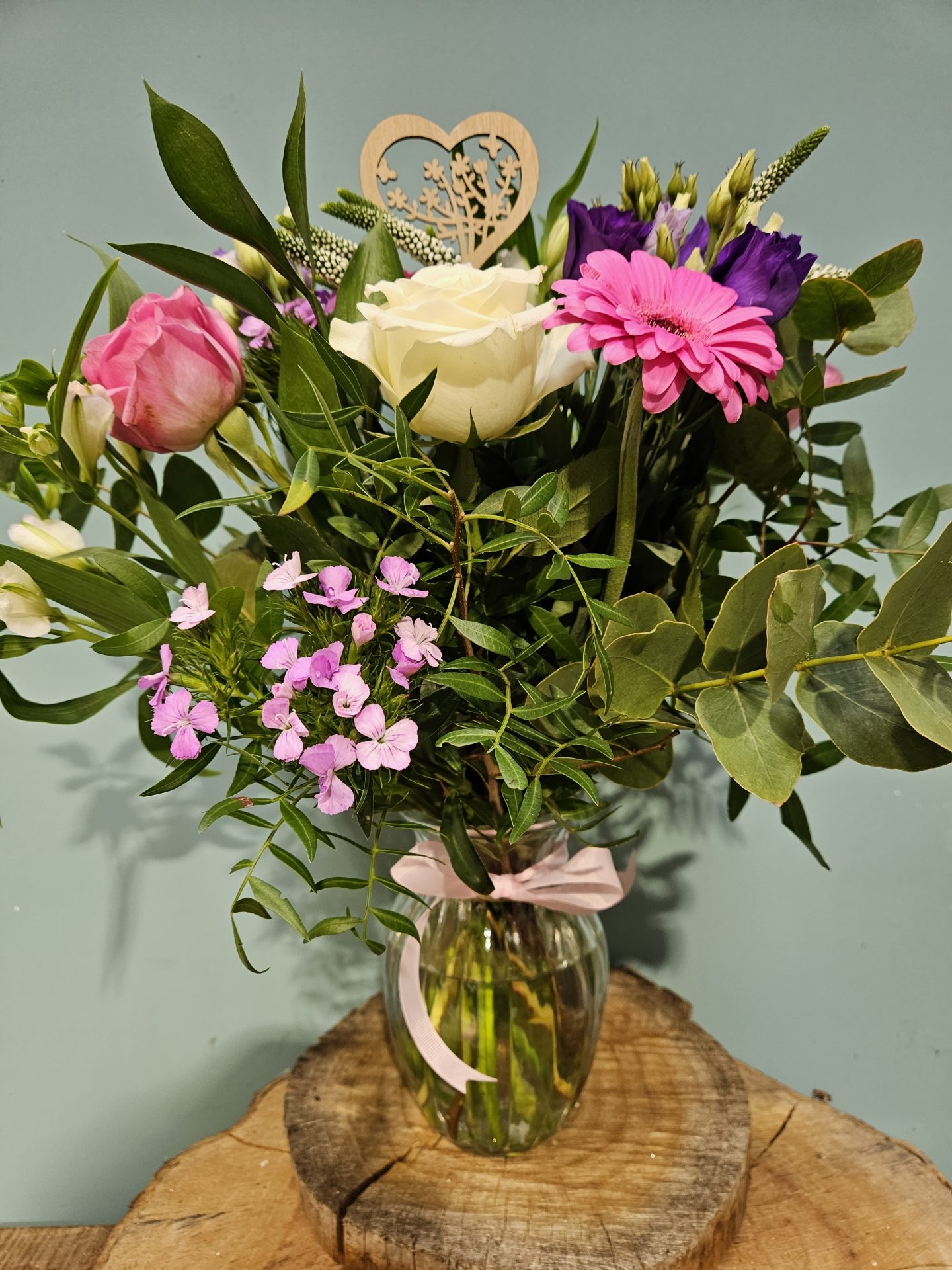 A beautiful mix of pretty purple, pink and white flowers in a keepsake clear glass vase, gift wrapped, a beautiful Mother’s Day gift