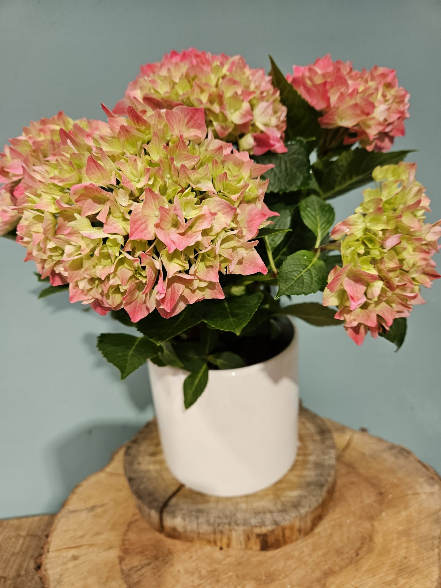An absolutely gorgeous pink hydrangea plant in a classic white ceramic pot, gift wrapped and ready to make that special someone’s day