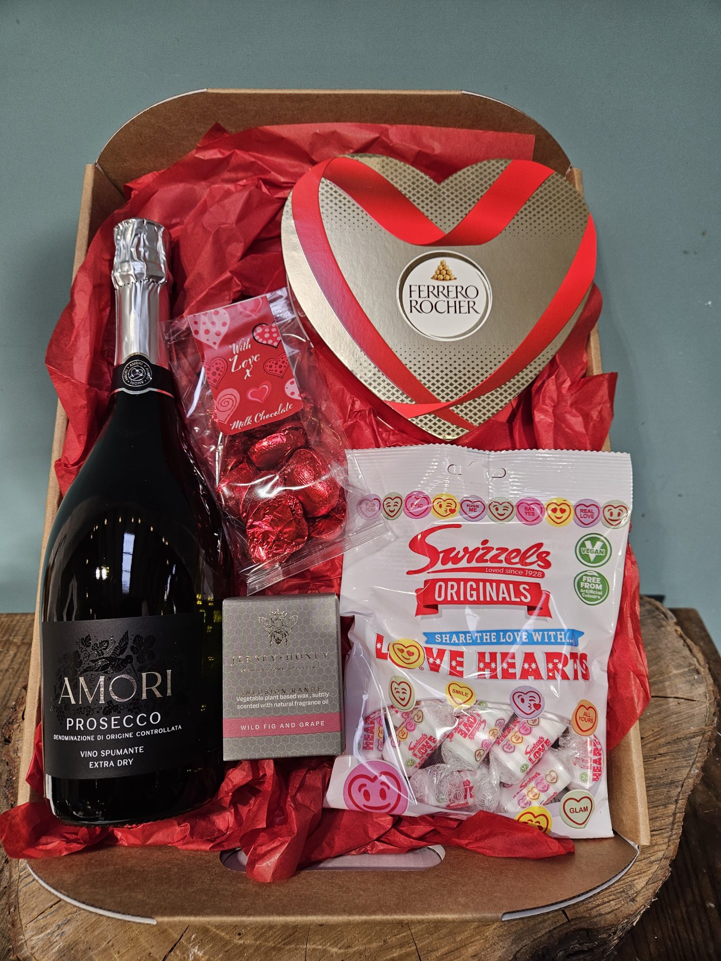 A lovely gift hamper with a bottle of Prosecco, a little Jersey Honey candle, a heart shaped box of chocolates and 2 packets of Valentine sweet treats, a romantic treat for a loved one