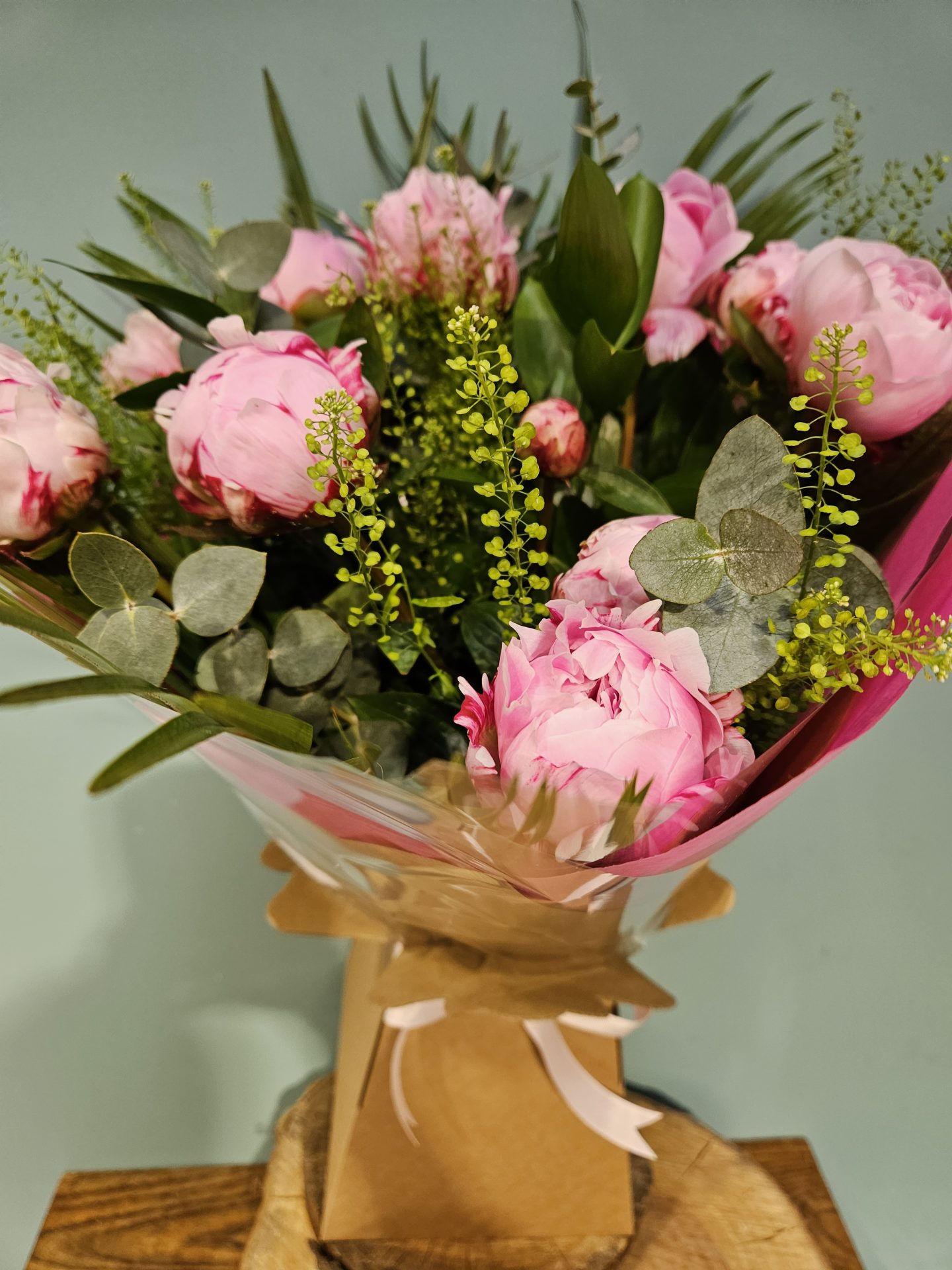 Gorgeous local pink peonies arranged as an aqua hand-tie bouquet with tasteful foliage….. simple, classic, beautiful