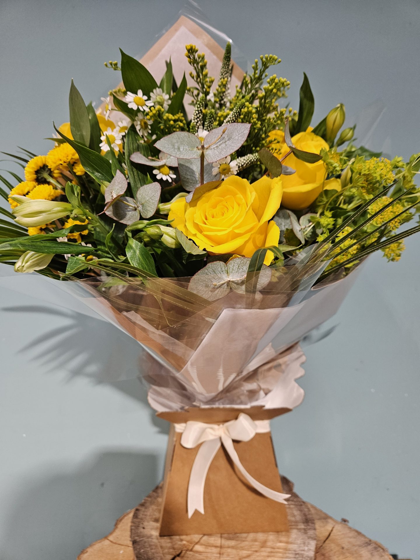 An uplifting selection of zesty yellow and white flowers with tasteful foliage arranged as an aqua handtie. Gift wrapped with a bow.