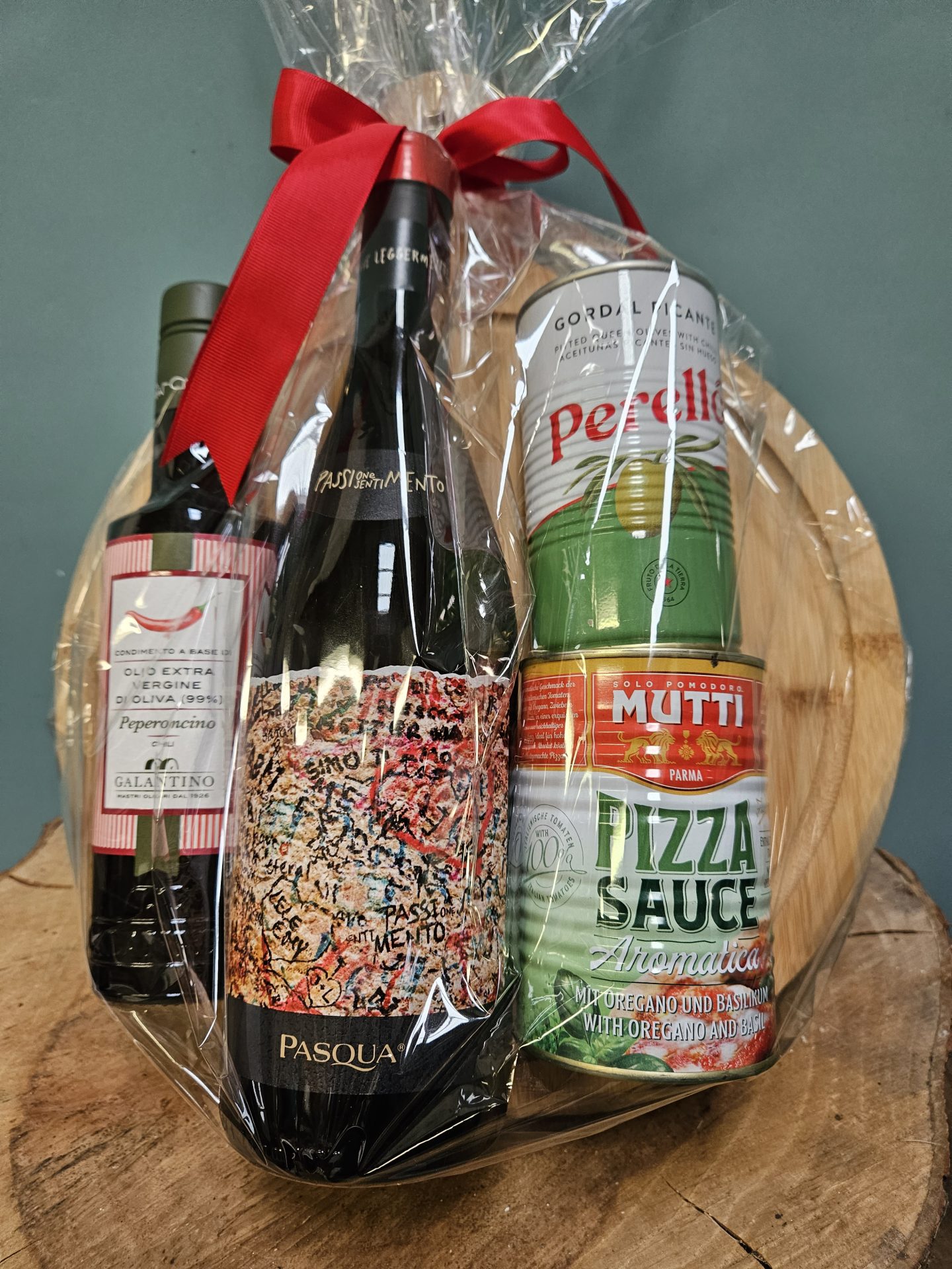 A fun gift hamper with pizza night treats, a bottle of delicious Italian red wine, a tin of tasty olives, a tin of gorgeous pizza sauce and a cheeky chilli olive oil all presented on a lovely keepsake wooden pizza board and gift wrapped