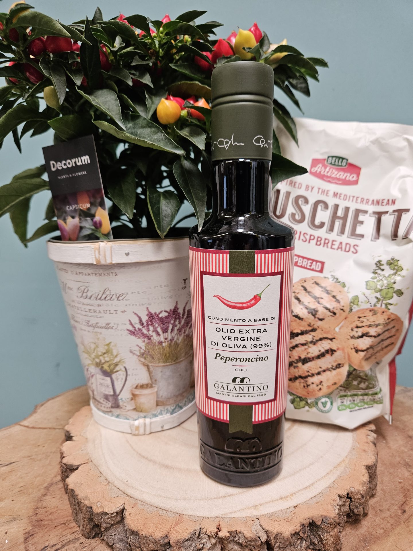 A lovely gift of a pretty pepper plant with a bottle of delicious Italian chilli olive oil and a bag of tasty bruschettas, something a bit different for that someone special